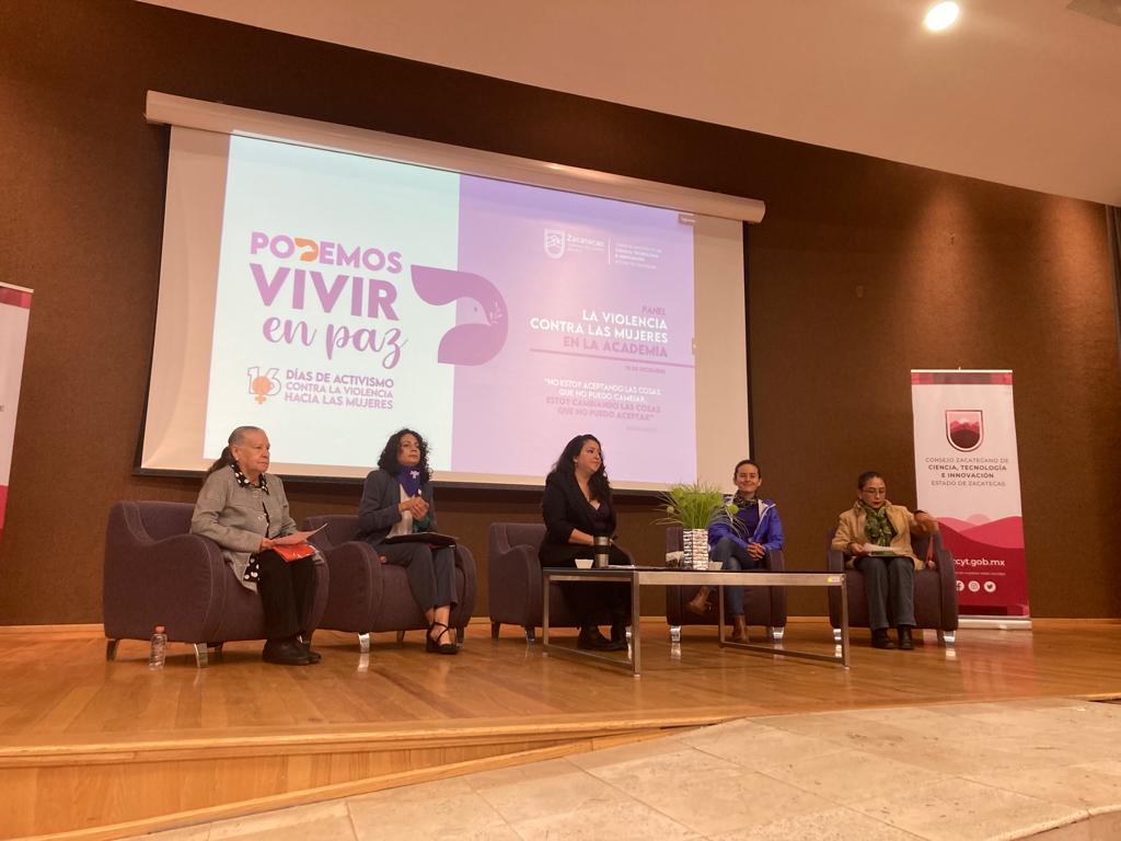 Tras la presentación del manifiesto contra la violencia de género, se desarrolló el Panel Violencia contra las Mujeres en la Academia, con las docentes investigadoras de la Universidad Autónoma de Zacatecas (UAZ), Alejandra Moreno y Virginia Flores; y las activistas Martha Mena y Julieta Rodríguez. Es de mencionar que Flores y Mena son integrantes de la Junta Directiva del Cozcyt.
