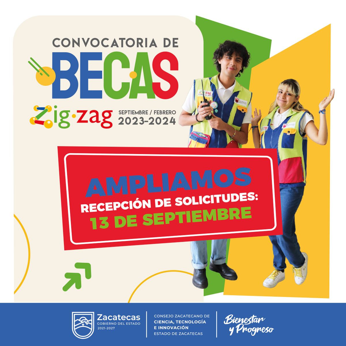 Zacatecas, Zac., 5 septiembre de 2023.- El Consejo Zacatecano de Ciencia, Tecnología e Innovación (Cozcyt) amplió, hasta el 13 de septiembre, la Convocatoria de Becas Zigzag, por lo que están a tiempo de participar las y los estudiantes de nivel medio superior y superior, interesados en ser Guías Zigzag, a fin de obtener un estímulo económico y realizar un servicio colaborativo en horarios que no interfieran con sus estudios.