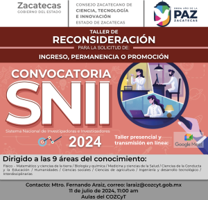 11 julio de 2024. Taller de Reconsideración para el ingreso al SNII 2024”, dirigido a las y los solicitantes que deseen presentar su solicitud de reconsideración al resultado otorgado, en aulas del COZCyT y en modalidad virtual a través de Google Meet. Más información |