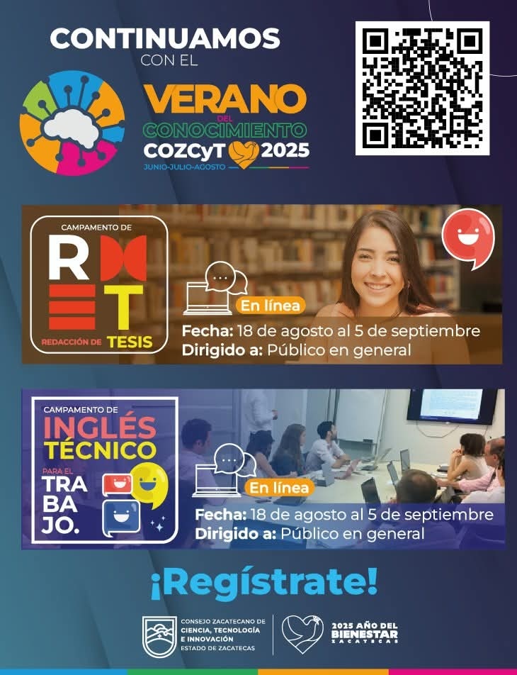 Zacatecas, Zac., 12 de agosto de 2025.- El Gobierno del Estado, a través del Consejo Zacatecano de Ciencia, Tecnología e Innovación (Cozcyt), invita a la población a inscribirse a los campamentos de Inglés Técnico para el Trabajo y Redacción de Tesis, que se llevarán a cabo del 18 de agosto al 5 de septiembre.