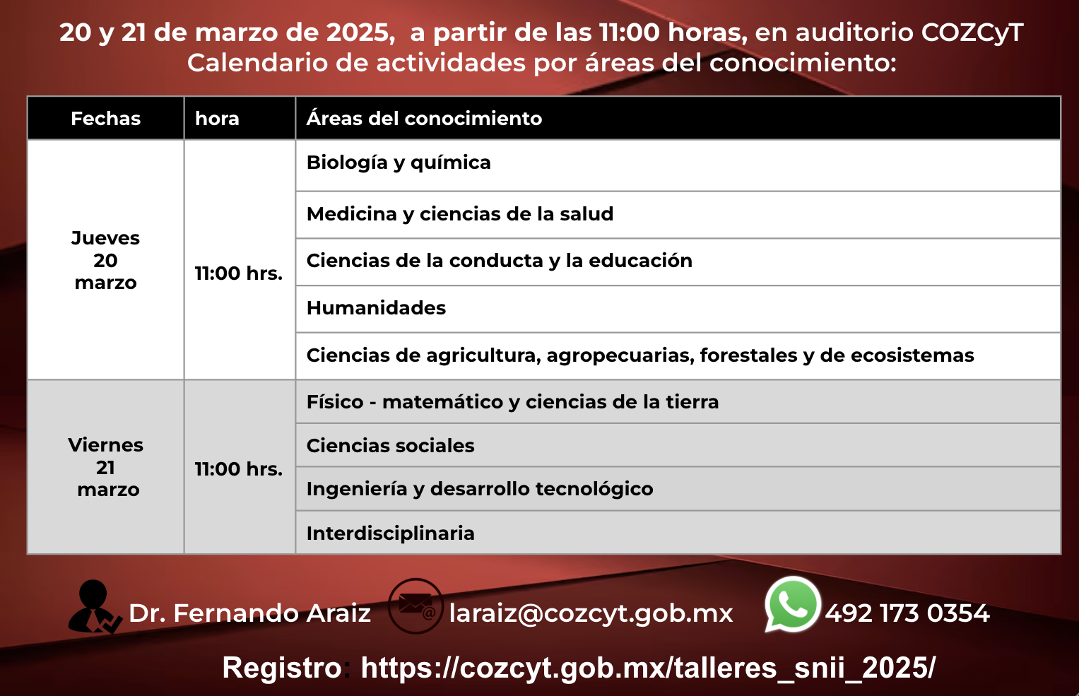 Estimados Docentes Investigadores en consideración a la publicación de la Convocatoria para el reconocimiento en el Sistema Nacional de Investigadoras e Investigadores (SNII) 2025, la cual tiene vigencia del 10 al 28 de marzo del año en curso, el Consejo Zacatecano de Ciencia, Tecnología e Innovación (COZCyT) busca implementar acciones que impulsen la participación de los investigadores y tecnólogos zacatecanos, por tal motivo llevaremos a cabo dos talleres informativos para el ingreso al SNII 2025 de forma presencial los días jueves 20 y viernes 21 de marzo ambos a las 11:00 horas.