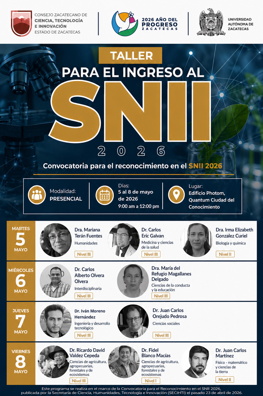 Taller para el Ingreso al SNII 2026 Por Fernando|2026-04-28T18:19:29-06:00abril 28, 2026|Actividades, Noticias|Comentarios desactivados en Taller para el Ingreso al SNII 2026 Registro al taller Comparte éste boletín FacebookTwitterRedditLinkedInWhatsAppTumblrPinterestVkXingEmail