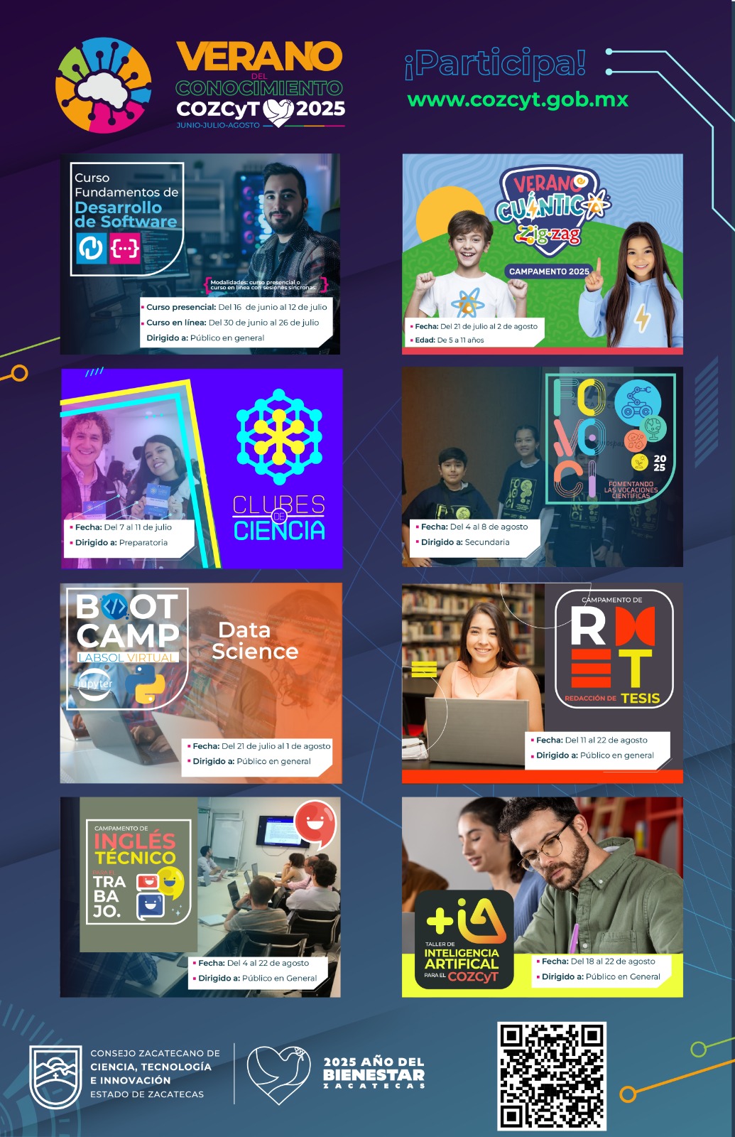 - Seis de estas actividades son gratuitas; mayor información podrá consultarse en el sitio web: https://cozcyt.gob.mx/verano-del-conocimiento/